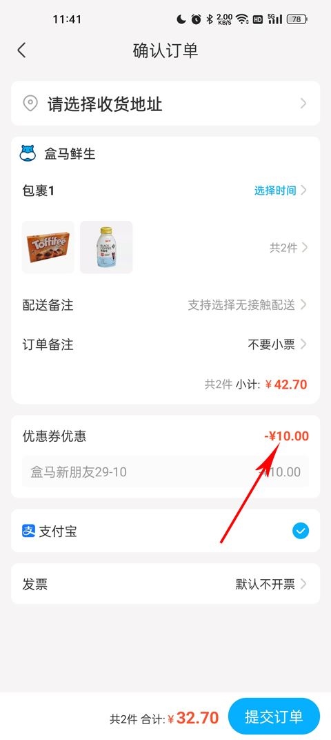 4、填写收货地址后,使用优惠券进行付款,这样能享受更多优惠。